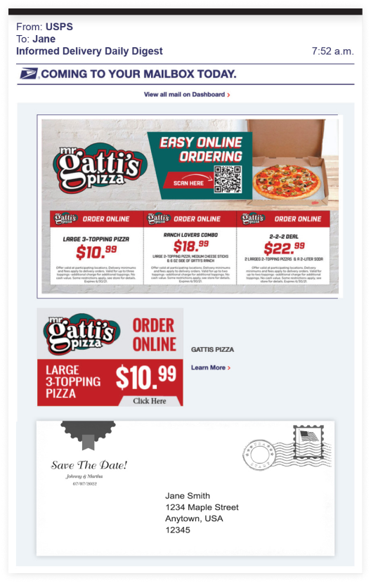 Informed Delivery is a USPS digital service where subscribers receive scanned images of their incoming mail via email, online dashboard or mobile app. With Valpak, your business will stand out from the black and white mail images with a color ad that includes a custom image and URL.
